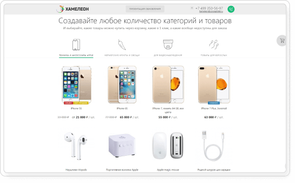 Можно создать любое количество категорий и товаров в них и использовать всё это на любых созданных на Хамелеоне лендингах