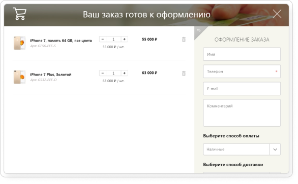 Корзина автоматически адаптируется и корректно отображается на всех типах устройств, в том числе и мобильных, делая процедуру заказа удобной и повышая конверсию сайта